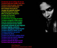 ... Ma tempête d'homme raconte A ta tempête de femme Des légendes somptueuses Où tout est bon, savoureux, Authentique et fou Et je te prends, te baise, te transforme Je te taille dans le bois, le marbre, le feu ! Je te taille dans la soie et le papier Et dans l'étoffe la plus lumineuse du cri ! ...